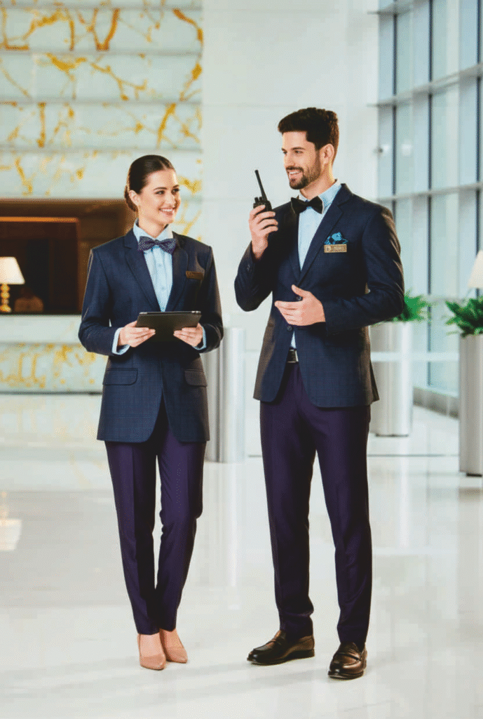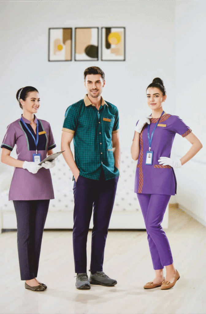 Tailored garment designs and customizable color palettes reflect specific hospitality brands and operational needs.